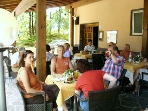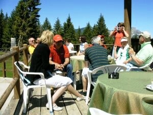 Nachdem man einen Almauftrieb auf der Hauptstrasse erlebt hatte (eigentlich handelte es sich um eine Gruppe von ausgerissenen Kühen und einem schwarz-weiss gemusterten Schaf, das sich wohl für eine Kuh hielt und in der Herde heimisch war) bog der Tourorganisator mit seinem Führungsfahrzeug scharf links ab und erkletterte einen steilen Berggrat, der auf der anderen Seite ins Tal des Eisack führte, so dass man Bozen umfahren konnte. Oben auf der Bergspitze befindet sich ein kleines Restaurant, das die SLK-Reisegruppe bestens mit Kaffee und kühlen Getränken versorgte.
