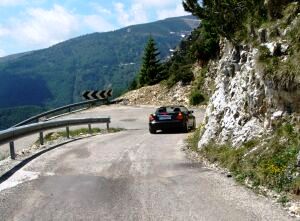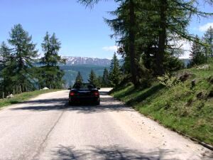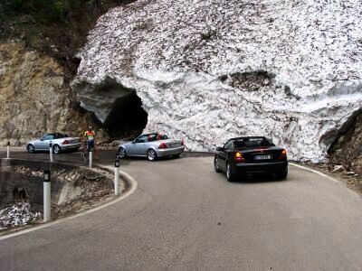 Anschliessend ging es wieder ins Tal hinab und die Kolonne erreichte das Veneto, wo wir in einem Ristorante zum Mittagessen erwartet wurden. Nach dem gemeinsamen Mittagessen kam uns der steile und enge Pass mit seinen 19 Doppel-Serpentinen so gerade recht unter die Räder. Der enge und steile Pass wurde nur im ersten und im zweiten Gang bewältigt. Oben angekommen, stoppte das Führungsfahrzeug zu einem Fototermin für alle Teilnehmer (18 SLK-Teams).
