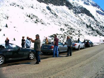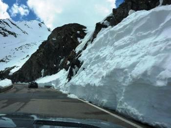 "Tag der Tage": Am Freitag rollten die Teams am malerischen Plansee vorbei und besuchten das Kloster Ettal, Oberammergau und die Wieskirche. Man ruhte sich heute ein wenig aus, ass im Biergarten des Klosterrestaurant Ettal zu Mittag und freute sich schon auf den kommenden Samstagmorgen. Bereits am Freitagnachmittag erhielt der Tourorganisator die telefonische Nachricht, dass das Timmelsjoch am kommenden Samstagmorgen um 08:00 Uhr geöffnet werden sollte! - Man darf nur einmal raten, wer am frühen Samstagmorgen schon unterwegs war... Die Freunde cruisten erneut über den Fernpass, durchquerten das Inntal und rollten das Ötztal hinauf zum Timmelsjoch. Auf der Passhöhe erwarteten bis zu fünf Meter hohe Schnee- und Eiswände die Teams. Durch diese Barriere war die Strasse gefräst und vom Schnee befreit worden. In den Tunneln des Timmelsjoch waren die Wände und die Decken noch tief vereist.