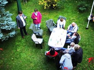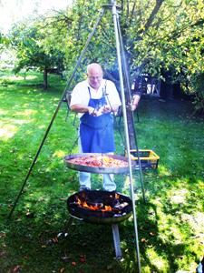 Immer wieder schmeckte Peter das kochendheisse Chili ab und würzte nach. Schon gegen 14:00 Uhr, der grösste Teil der angemeldeten Freunde war schon eingetroffen, standen die ersten hungrigen Freunde vor der Kochstelle im Obstgarten und waren mit Suppenschale und Löffel bewaffnet. Während man im Obstgarten sass und endlose Benzingespräche führte, machten sich einige Freunde über die Zwetschgen- und Apfelbäume her. Sie pflückten das reife ungespritzte Obst und verstauten es in ihren SLK-Roadstern. Langsam setzte die Dämmerung ein. Schnell räumte man gemeinsam die Tisch- und Sitzgarnituren zur Seite und begab sich zusammen in die Motorsportagentur im ersten Stock des Hauses. Peter legte einige Video-DVD von den gemeinsamen Italientouren ein, und die Freunde sprachen über die gerade beendete SLK-Reise zum Gardasee und über die im kommenden Jahr anstehenden Unternehmungen.